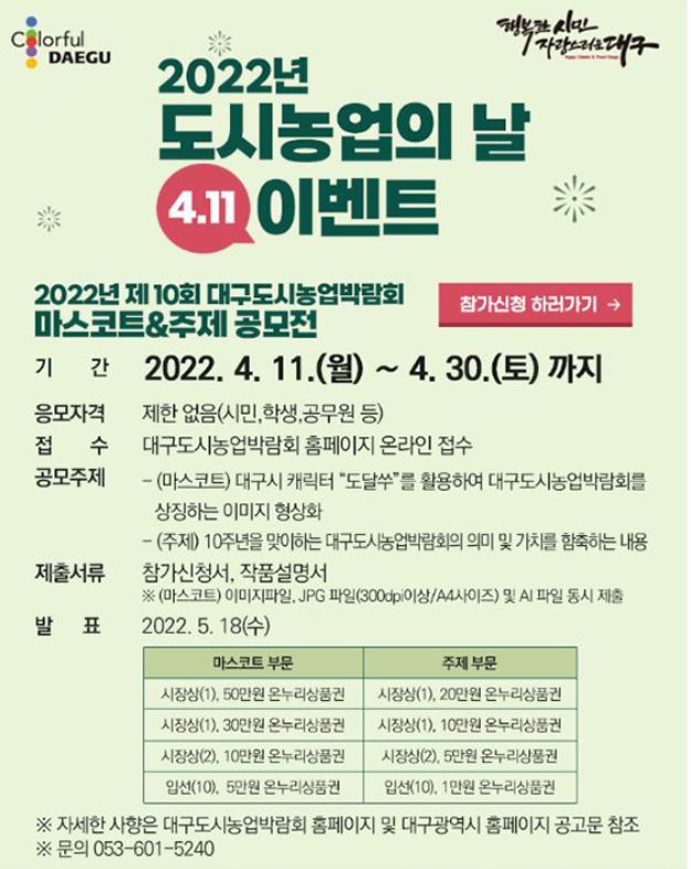 대구시는 도시농업의 날을 맞아 도시농업을 널리 알릴 수 있는 '마스코트'를 정하기 위해 공모전을 엽니다.대구시의 캐릭터인 '도달쑤'를 활용해 도시농업 박람회를 상징하고 의미와 가치를 함축적으로 표현하는 이미지를 '마스코트'로 만들면 됩니다.선정된 마스코트는 오는 9월 30일부터 10월 3일까지 열리는 대구 도시농...