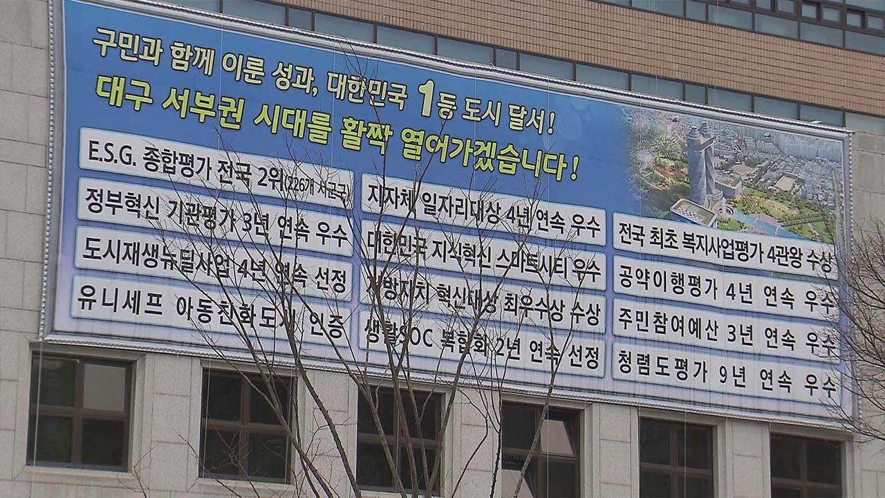 지자체는 단체장 치적 홍보를 위한 불법 현수막을 즉각 철거하라고 우리복지시민연합이 촉구하고 나섰습니다.복지연합은 "대구 달서구청과 동구청 등이 정책 홍보와는 동떨어진 노골적인 치적 홍보형 현수막들을 구민 세금으로 만들고 관련 법을 위반하면서까지 장기간 걸어놓고 있다"며 "지방선거를 의식한 불법 현수막을 ...