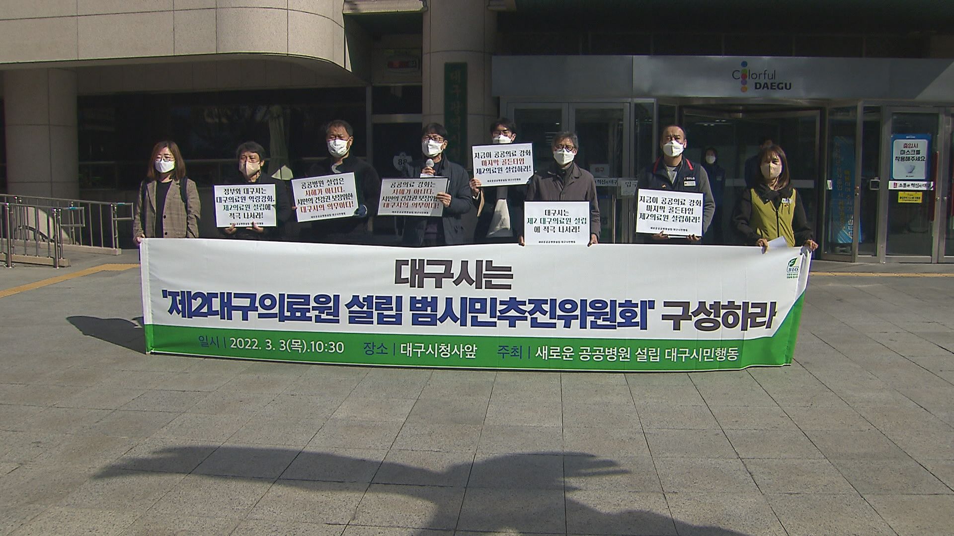 새로운 공공병원 설립 대구시민 행동은 대구시에 '제2 대구의료원 설립 범시민 추진 위원회'를 구성하라고 촉구했습니다.이들은 "최근 타당성 조사 용역 결과 제2 대구의료원의 필요성, 타당성이 확인됐다"며 "대구시는 숙의 기반 공론화를 거치지 말고 서둘러 설립을 확정해 구체적인 로드맵을 제시하라"고 주장했습니다....