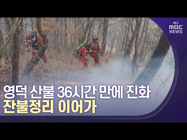 ◀앵커▶ 경북 영덕에서 발생한 대형 산불이 36시간 만인 2월 17일 오후 2시 반쯤 꺼졌습니다.일단, 큰 불길은 잡았습니다. 하지만 불씨가 살아날 가능성이 있어 안심할 수 없는 상황이죠, 산림당국도 긴장의 끈을 놓지 않고 있습니다.박성아 기자가 취재했습니다.◀기자▶ 산 자락에서 시뻘건 불길과 함께 희뿌연 연기가 치솟...