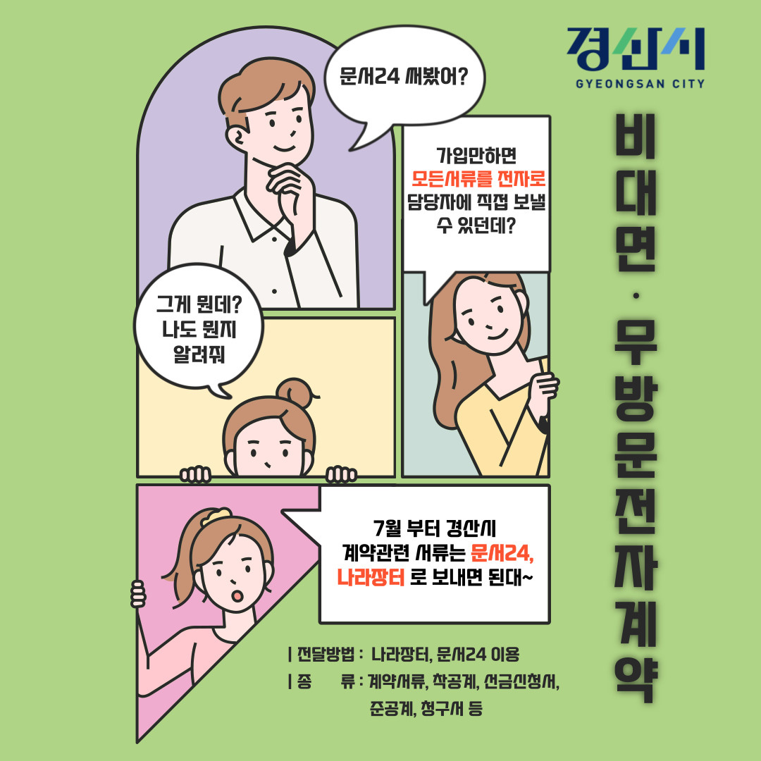 경북 경산시가 7월부터 비대면·무방문 전자계약을 도입합니다.비대면·무방문 전자계약은 공사나 용역, 물품 계약을 경산시와 할 때 내야 하는 서류를 온라인으로 낼 수 있게 해 계약 업무 처리 과정의 비효율적인 측면을 개선한 것입니다. 경산시는 계약 업무 처리를 위해서는 계약 체결, 착수·완료계 제출, 청구 서류 제출...