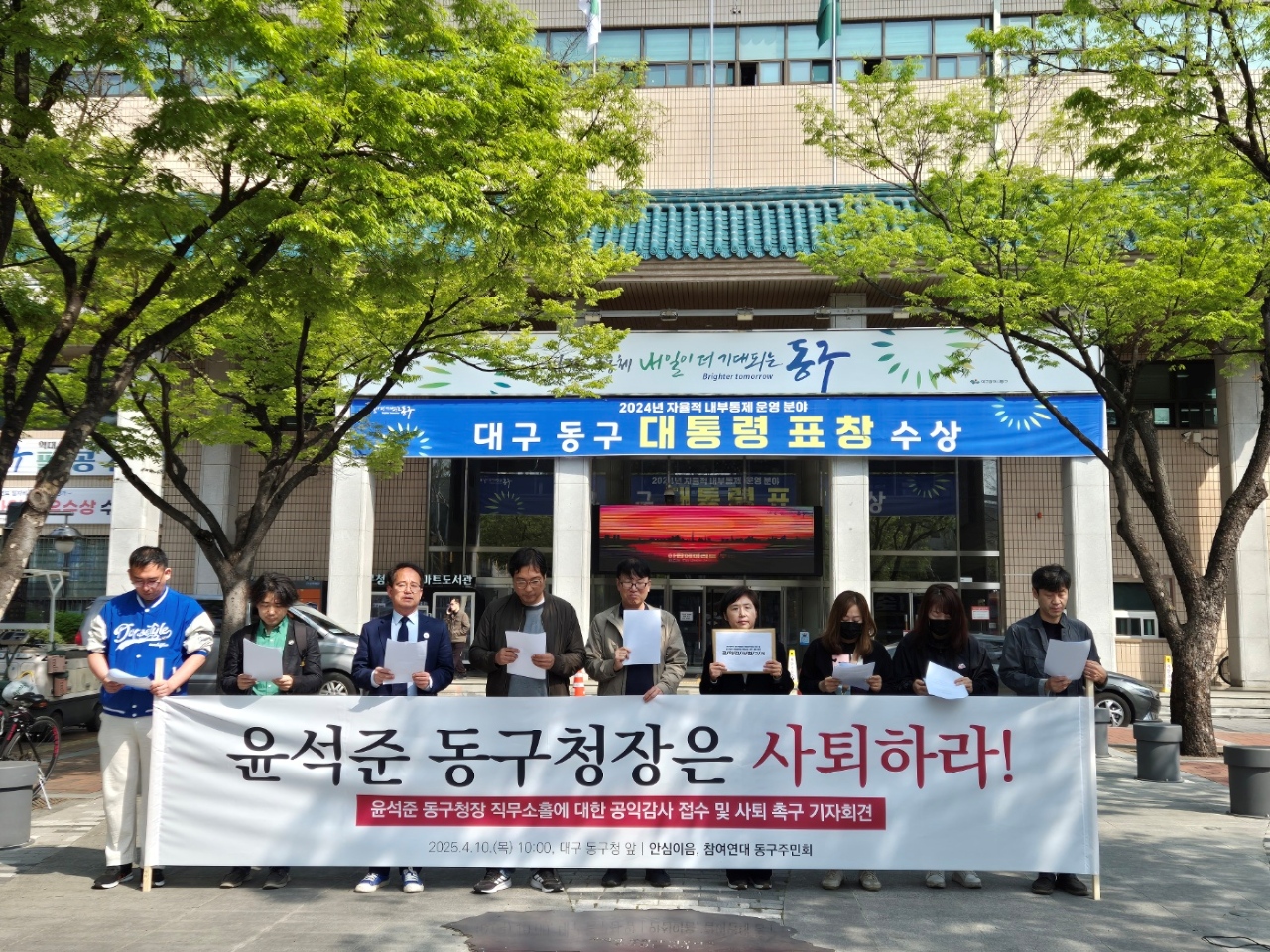 잦은 결근으로 1년 넘게 직무 소홀 논란을 빚어온 윤석준 대구 동구청장에 대해 주민들이 공익감사를 청구했습니다.동구 주민들로 구성된 시민단체 안심이음과 참여연대 동구주민회 등은 4월 10일 기자회견을 열고 "300여 명의 주민 서명을 받아 동구청장 및 동구청에 대해 공익 감사청구서를 감사원에 제출한다"고 밝혔습...