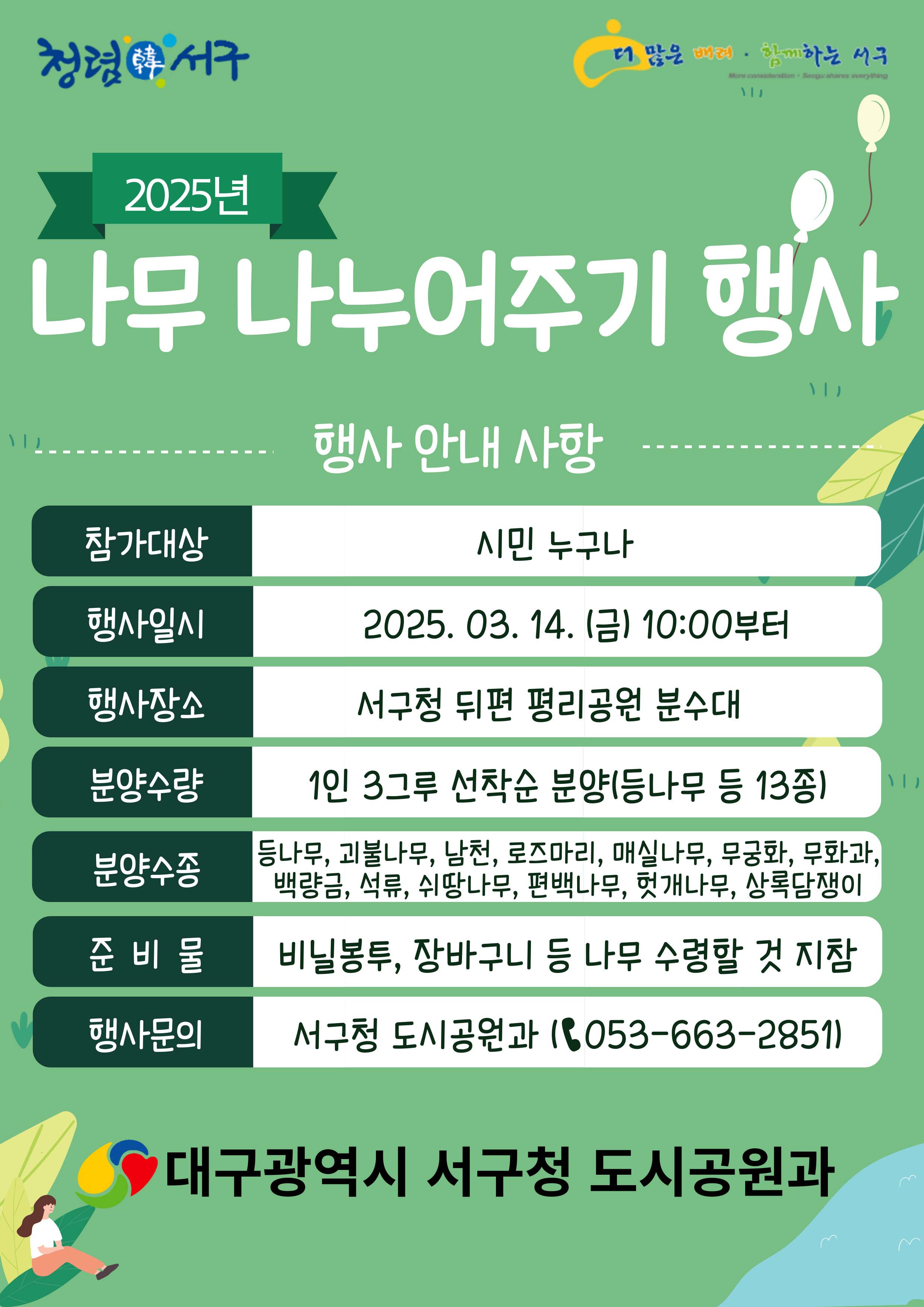 사진 제공 대구 서구, 남구식목철을 맞이해 대구에서도 나무 나눠주기 행사가 열립니다.대구 서구는 3월 14일 오전 10시부터 평리공원에서 매실나무와 무화과, 무궁화 등 13종 나무 2천9백여 그루를 나눠줍니다. 대구 남구는 같은 날 오전 10시 구청 후문 iM 뱅크 입구에서 로즈메리와 무화과 등 13종 나무 2천9백여 그루와...