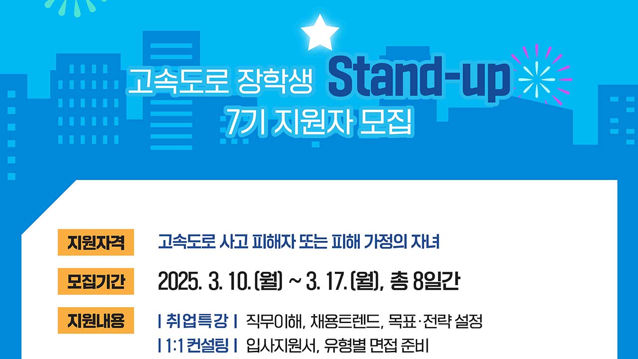 사진 제공 한국도로공사한국도로공사 고속도로장학재단이 고속도로 사고 피해 가정 자녀의 취업 활동을 지원하는 Stand-up 프로그램 참가자를 모집합니다.모집 기간은 3월 10일부터 17일까지로 선발된 참가자들에게는 3월부터 10월까지 입사지원서 작성법과 취업 추세·전략을 알려주는 취업 특강, 개인별 맞춤 컨설팅(입사...