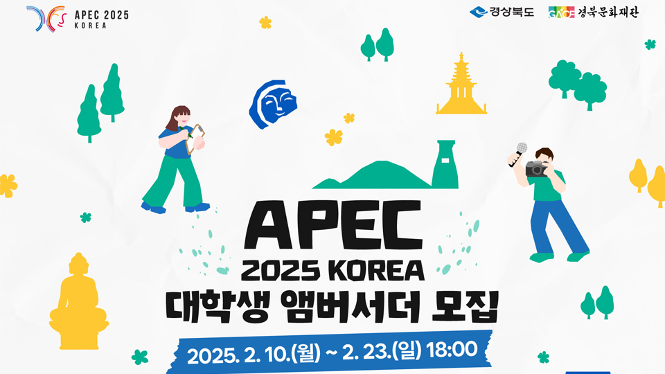APEC 준비 지원단은 2025년 APEC 정상 회의의 홍보를 맡을 대학생 앰배서더를 모집합니다. 경상북도는 홍보 콘텐츠 제작과 확산을 통해 2025년 APEC 정상 회의 경북 경주 개최를 널리 알리고, 국민의 관심과 참여를 유도하는 데 동참할 대학생 앰배서더를 모집합니다. 전국의 대학생과 국내 거주 해외 유학생은 전공과 관계...