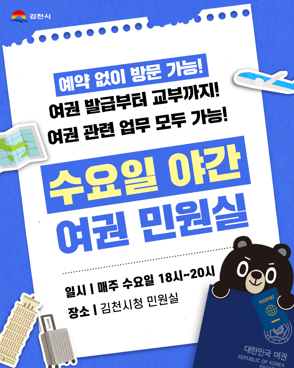 사진 제공 경북 김천시경북 김천시가 야간 여권 민원실을 매주 수요일로 확대 운영합니다. 김천시는 매달 첫째, 셋째 주 수요일 오후 7시부터 8시까지 운영하던 야간 여권 민원실을 매주 수요일 오후 6시부터 8시까지 운영하기로 했습니다. 또, 사전 예약을 통해 여권 신청만 할 수 있던 것을, 신청이나 교부 등 여권 전반...