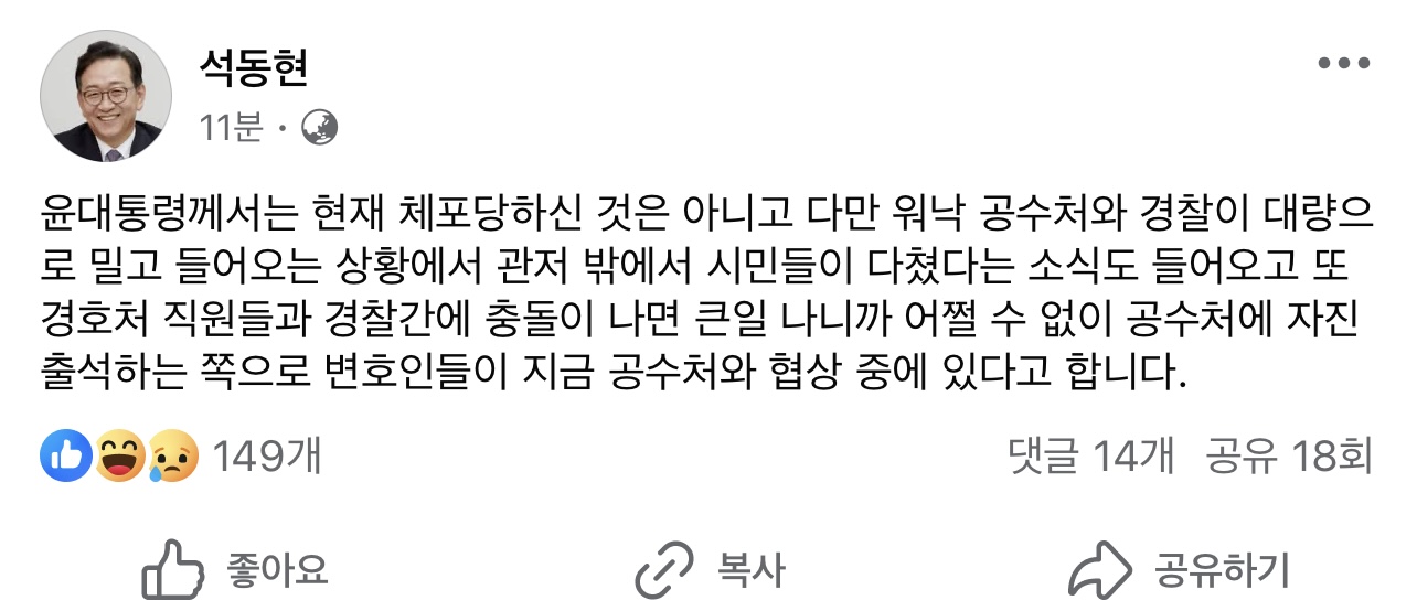 윤석열 대통령 측이 공수처의 체포영장 집행과 관련해 자진 출석을 논의하고 있다고 밝혔습니다.석동현 변호사는 오늘 오전 8시 40분쯤 자신의 페이스북을 통해 "윤 대통령이 현재 체포당한 것은 아니고, 공수처와 경찰이 대량으로 밀고 들어오는 상황에서 경호처 직원들과 충돌하면 큰일 나니 어쩔 수 없이 공수처에 자진 ...