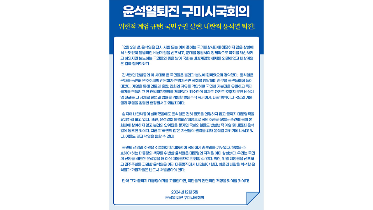 경북 구미 지역 시민사회단체들도 위헌적 계엄을 규탄하면서 윤석열 대통령의 퇴진을 촉구했습니다.구미 지역 시민사회단체 등이 참여한 윤석열 퇴진 구미 시국 회의는 성명을 내고 "국민의 생명과 주권을 수호해야 할 대통령이 국민에게 총부리를 겨누었다"라면서 윤석열 대통령을 향해 "헌법을 수호해야 하는 대통령의 책...