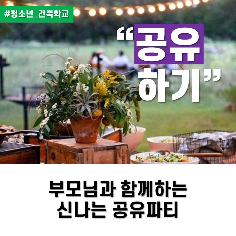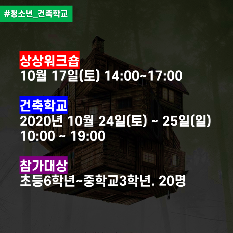 먼저 10월 17일(토)에는 청소년 참가자들과 예술가들이 만나서 어떤 집을 지을 지 상상력을 발휘하여 아이디어를 모으는 ‘상상워크숍’이 진행되고, 10월 24일(토), 25일(일) 이틀간 야외에서 집을 짓는 ‘청소년 건축학교’가 진행된다. ‘청소년 건축학교’의 마지막 날인 25일(일) 오후 5시부터는 완성된 집에 부모님과 가족들을 초대하는 소소한 결과공유회인 ‘공유파티’도 열릴 예정이다.