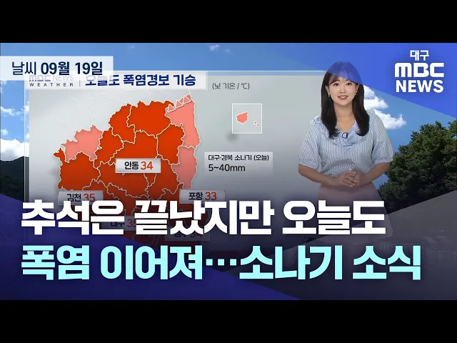 9월 19일 목요일 대구와 경북 전역에 폭염특보가 발효 중인 가운데 낮부터 저녁 사이 소나기가 오는 곳이 있겠습니다.소나기는 돌풍과 천둥, 번개를 동반하겠고 예상 강수량은 5~40mm입니다.밤사이 최저 기온은 포항 25도로 열대야가 나타난 곳이 있고, 대구 24.5도, 안동 22.9도 등을 보였습니다.낮 최고 기온은 대구와 김...