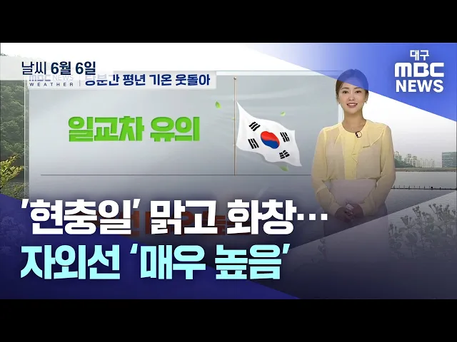 제69회 현충일인 오늘도 맑고 화창한 날씨가 펼쳐집니다.기온도 평년보다 높겠는데요.현재 대구의 기온 16도, 안동 15도, 포항 17도 가리키고 있습니다.낮 기온은 대구와 안동 28도, 포항 25도까지 오르겠고요.오늘과 내일 내륙을 중심으로 낮 기온이 30도 내외로 오르는 곳도 있어 덥겠습니다.당분간 평년을 웃도는 기온이...
