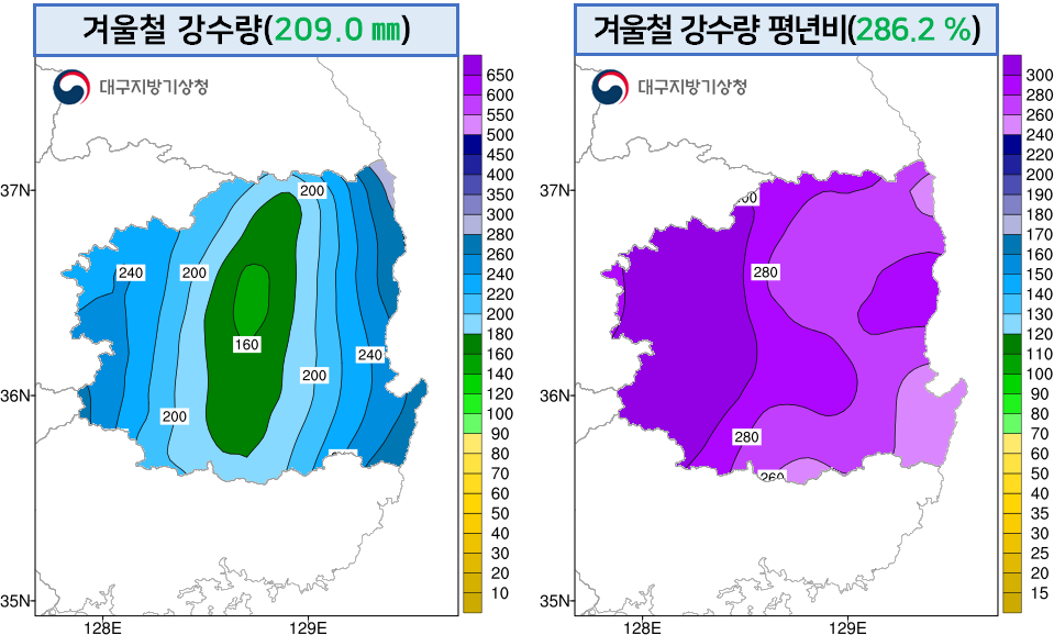 지난겨울 대구‧경북 지역에 역대 가장 많은 비가 내린 것으로 나타났습니다.대구지방기상청이 발표한 '대구‧경북 2023년 겨울철 기후 특성'을 보면, 2023년 12월부터 지난달까지 대구‧경북 지역 강수량은 209㎜, 강수일수는 27.8일로 기상 관측을 시작한 이래 가장 많았습니다.기상청은 따뜻하고 습한 남풍이 자주 불면서 ...