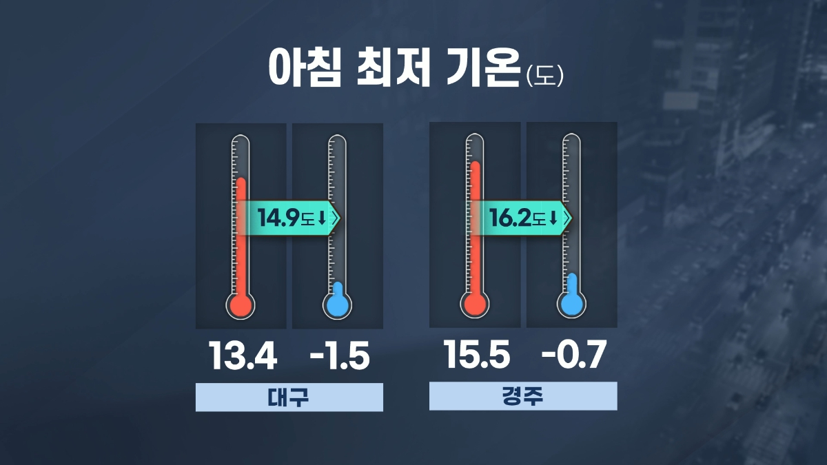 11월의 마지막 날 찬바람이 뼛속까지 파고들고 있습니다.북서쪽에서 내려오는 찬 공기의 영향으로, 하루 사이 기온이 15도 이상 급격히 떨어지면서, 현재 대구와 경북 전 지역에 '한파경보'가 발효 중입니다. 영하권 강추위 속 바람도 매우 강하게 불겠는데요. 경북 북동 산지와, 경북 남부 동해안, 울릉도와 독도에는 '강...