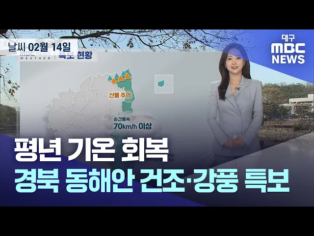 2월 14일 금요일 대구와 경북 지역은 오후부터 차차 흐리겠고 일교차도 매우 크겠습니다.낮 최고 기온은 대구 12도 등 8~12도의 분포로 2월 전날보다 4~5도가량 높겠습니다.경북 동해안 지역에는 건조주의보가 발효 중입니다.동해안과 북부 내륙에는 바람이 강하게 부는 곳도 많겠습니다.토요일은 대체로 흐리겠고 아침 최...