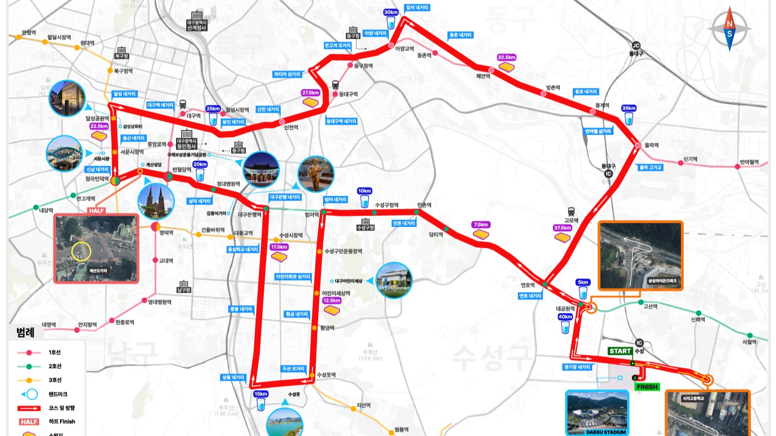 사진 출처 대구시사진 출처 대구시2024년 4월에 열리는 대구 국제마라톤대회 코스가 국제 공인 인증을 받았습니다.2023년까지 대구 국제마라톤은 국채보상운동기념공원을 출발해 도심을 도는 세 바퀴 도는 '루프' 코스였지만, 2024년부터는 대구스타디움을 출발해 시내 전역을 한 바퀴 도는 순환 코스로 바뀝니다.대구시와 ...
