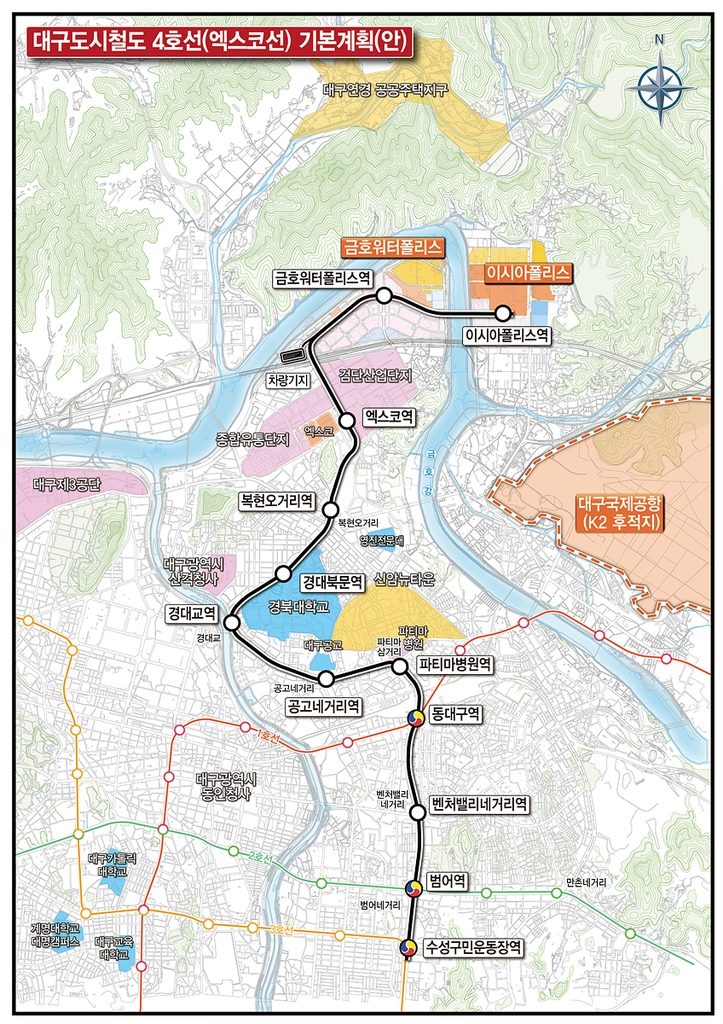 사진 제공 대구시대구시가 2030년 개통 예정인 도시철도 4호선 기본계획을 확정·발표했습니다.노선은 지난 2월 공청회 때 발표한 것과 동일합니다.도시철도 역사는 공고 네거리와 경대교 역을 추가해 10곳에서 12곳으로 늘었고, 엑스코 역은 북쪽으로 150m가량 옮겨 엑스코와 종합 유통단지 접근성을 높이기로 했습니다.차...