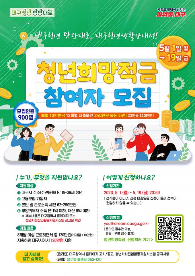 사회 초년생 청년들의 자산 형성을 돕기 위한 '청년희망적금' 사업이 시행됩니다.대구시는 대구에서 일하는 청년이 한 달에 10만 원씩 1년 동안 저금하면 만기에 추가로 120만 원을 지원합니다.대구에 거주하는 근로소득 월 62만 원에서 250만 원 사이 만 19세에서 39세 청년이 대상으로, 부모나 배우자 소득이 연 1억 원 ...