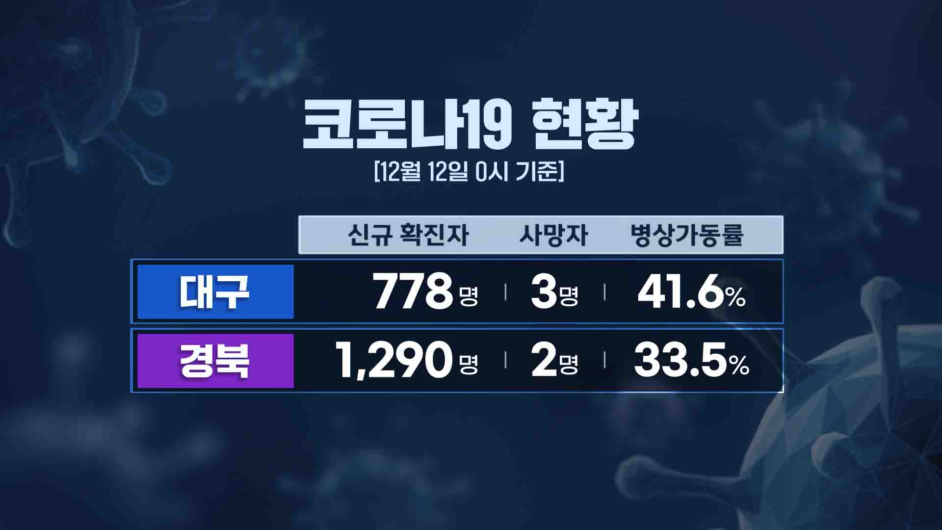 대구지역 코로나 19 신규 확진자는 778명입니다.11일 2,281명보다 많이 줄었지만 휴일 동안 검사가 줄어든 영향입니다.코로나 19로 인한 사망자는 3명으로 50대 이하와 70대, 80대 환자로 2명은 백신 미접종, 한 명은 3차 접종을 했습니다.대구지역 코로나 19 전담 치료 병상 가동률은 41.6%이며 12,000여 명이 재택 치료를...