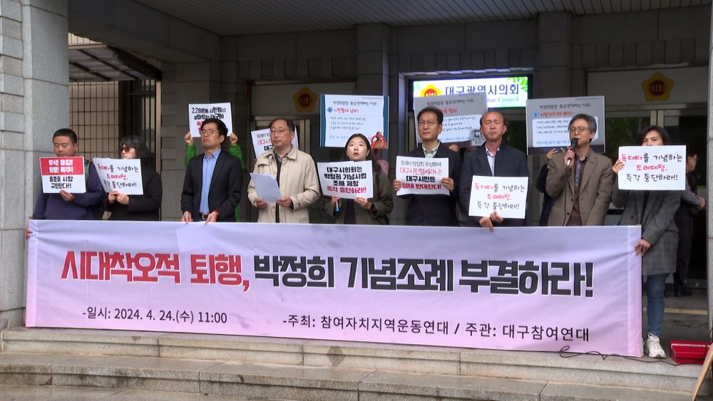 전국 18개 참여자치 지역 운동연대가 박정희 전 대통령 기념 사업 추진을 반대하며 관련 조례 부결을 촉구했습니다.부산, 울산, 인천 등 18개 지역 운동단체는 4월 24일 오전 11시 대구시의회 앞에서 기자회견을 열고 "경제 성장의 성과가 있다고 하더라도 유신 독재와 국민 기본권 억압을 밑거름으로 이룬 것을 치적으로 ...