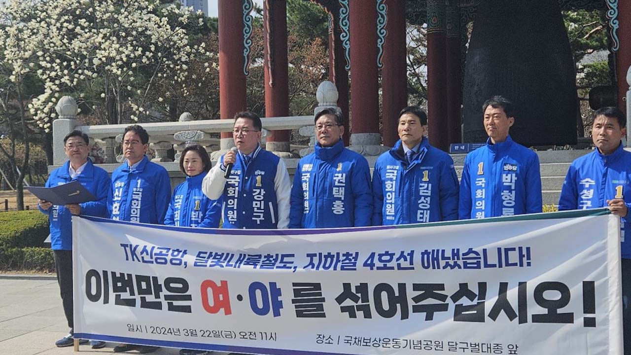 제22대 국회의원 선거 후보 등록을 마친 더불어민주당 대구 후보 8명이 합동 기자회견을 열고 이번 선거는 정권 심판이라고 강조했습니다.후보들은 "이종섭 대사와 황상무 전 수석 사태에서 보듯이 대통령은 친목회장을 해야 할 인물"이라며 정권 심판을 부각했습니다. 또, "민주당은 2023년과 2024년 대구 관련 예산 확보...