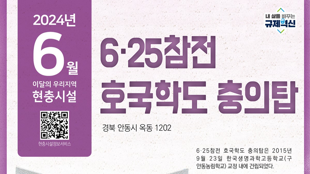 사진 제공 국가보훈부 경북북부보훈지청경북북부보훈지청은 안동 한국생명과학고등학교 교정에 건립된 6·25 참전 호국 학도 충의탑을 6월 이달의 우리 지역 현충 시설로 지정했습니다. 6·25 참전 호국 학도 충의탑은 2015년 9월 23일 건립됐습니다. 자유민주주의 대한민국의 운명이 바뀌었을 수도 있었던 6·25전쟁이 발발하...