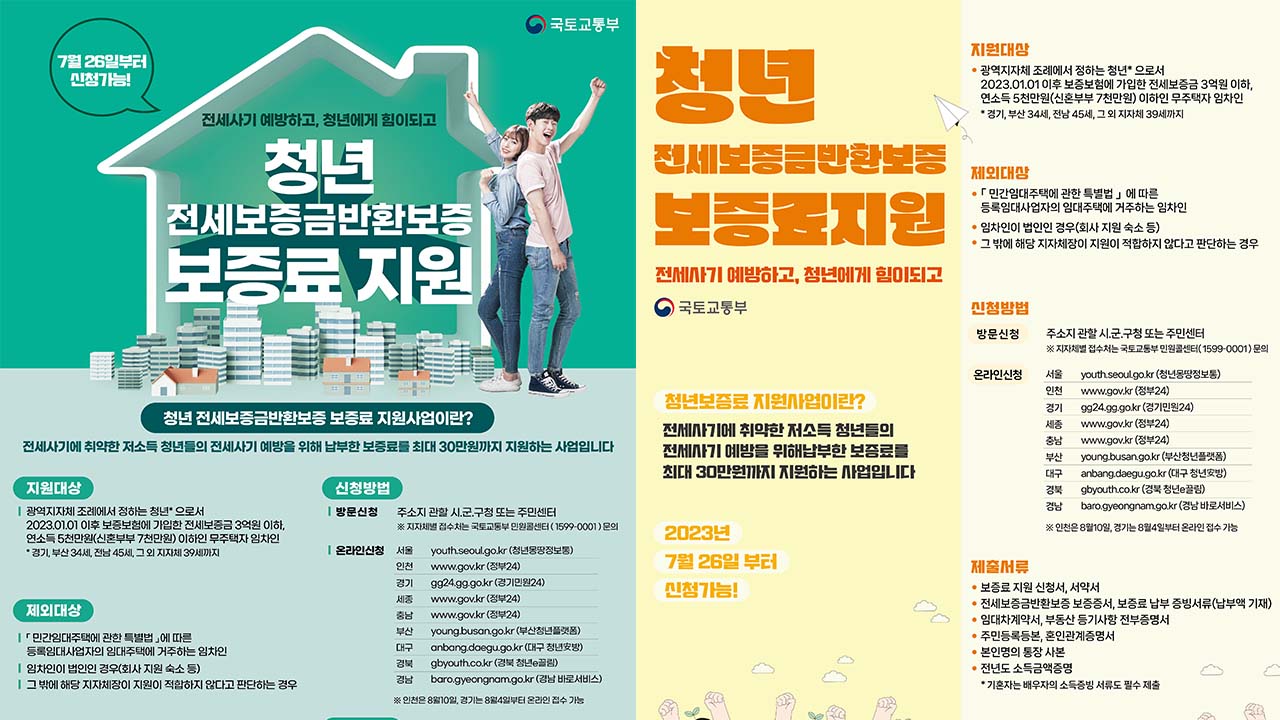 경북 경산시가 전세 사기나 역전세 현상으로 전세 보증금을 돌려받지 못하는 피해를 막기 위해 청년층에 전세보증금 반환 보증료를 최대 30만 원까지 지원합니다.2023년 1월 1일 이후 전세금 반환보증에 가입한 만 15세 이상 39세 이하 청년으로 임차 보증금 3억 원 이하, 연 소득 5천만 원 이하면 신청할 수 있고 신혼부부...