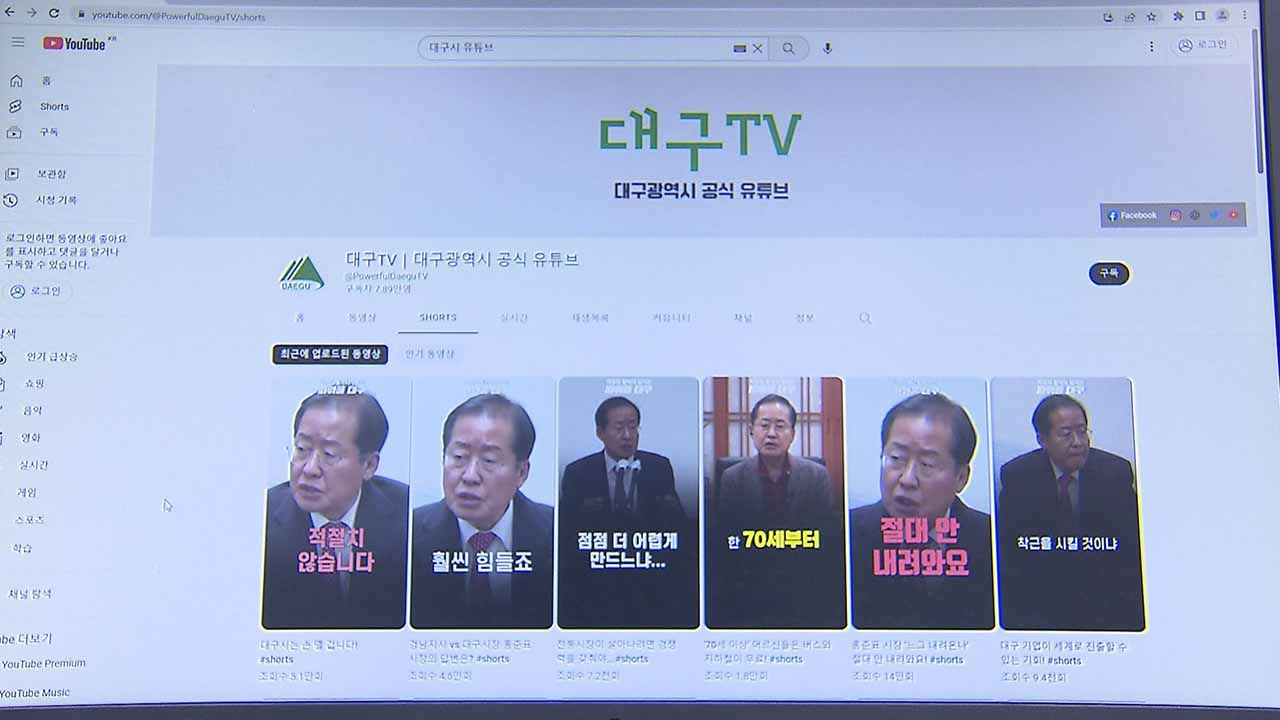 ◀앵커▶요새 지방자치단체마다 공식 유튜브 채널을 만들어 시정을 홍보하고 있습니다.그런데 대구시 공식 유튜브 채널이 시 정책을 알리기보다는 홍준표 시장 개인 홍보에 치중하고 있다는 지적이 나오고 있습니다.양관희 기자와 자세한 소식 알아보겠습니다. 양 기자, 대구시 공식 유튜브에 홍 시장 개인 홍보성 영상이 실...