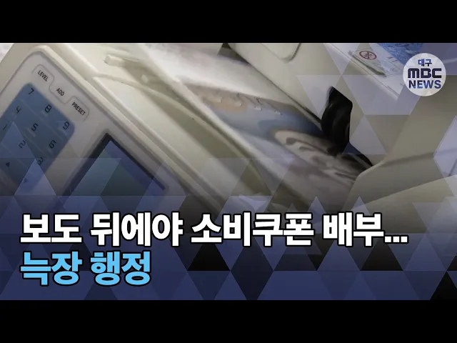 ◀ANC▶국비 사업으로 전국의 저소득층에게 주는 소비쿠폰을정작 가장 시급한 대구시와 일선 구·군은 늑장 지급한다고 지난 금요일 보도해드렸는데요.대구시가 20일부터 지급하겠다고 밝혔습니다.의료진 수당도 MBC가 보도한 뒤에야 지급하는 등 대구시의 소극적 행정이 여론의 뭇매를 맞고 있습니다.양관희 기자가 보도...