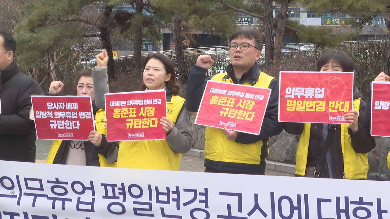 ◀앵커▶대형마트 의무 휴업일을 평일로 변경하는 대구의 각 구·군청의 고시가 2월 10일 발표됐습니다.이에 맞춰 대형마트는 오는 일요일 정상영업에 들어가고 월요일에 쉬는데요.마트노조는 고시 절차에 문제가 많다며 법원에 고시 집행정지를 신청했습니다.양관희 기자와 자세한 소식 알아보겠습니다. 양 기자, 논란 끝에 2...