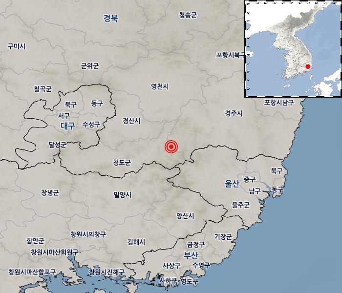 경북 청도 규모 2.4 지진···계기진도 3 "실내·건물 위층 현저히 느끼는 정도"