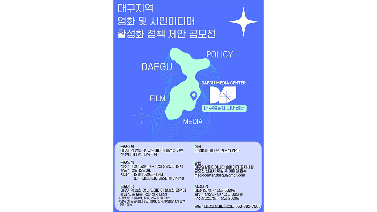 대구영상미디어센터는 12월 8일까지 대구지역 영화 및 시민미디어 활성화를 위한 정책 제안을 공모합니다. 교육, 창작, 유통 등 정책 전 분야에 걸쳐 자유롭게 주제를 정해 센터 홈페이지 공지 사항의 신청서 양식으로 2,500자 이내 원고를 작성해 이메일로 접수하면 됩니다. 공모 결과는 12월 12일 발표되며, 12월 15일 열...