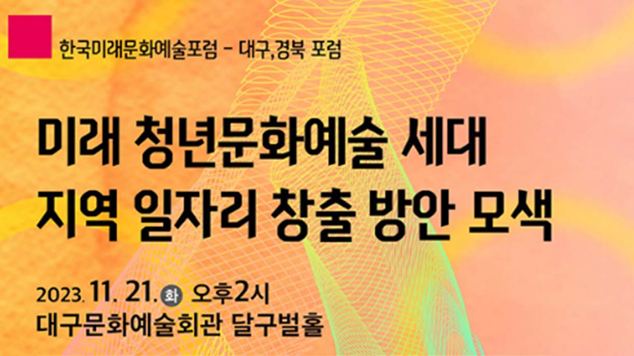 한국미래문화예술포럼은 11월 21일 오후 2시 대구문화예술회관 달구벌홀에서 미래 청년문화예술 세대 지역 일자리 창출 방안을 모색하는 대구·경북 포럼을 개최합니다.박순태 대구문화예술진흥원 문화예술본부장이 '청년문화예술인 일자리 창출을 위한 정책대안 모색'을 주제로 발표합니다.손경찬 한국예총 감사가 지역의 ...