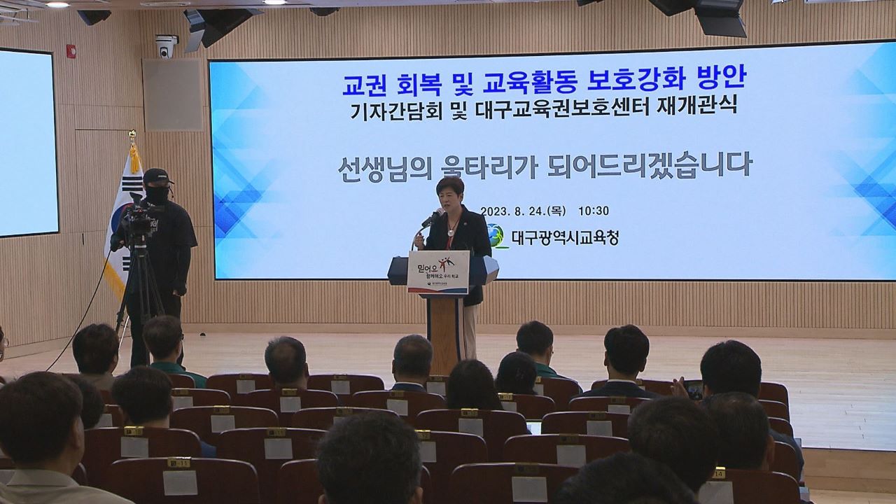 ◀앵커▶교권 침해가 점점 심각해지는 가운데 대구시 교육청이 8월 24일 교권 보호 강화 대책을 발표했습니다.8월 23일 교육부가 발표한 대책의 연장선으로 보이는데, 실효성 있게 작동되기 위해서는 교육 현장을 정확하게 파악하는 일이 중요하다는 지적이 나옵니다.이상원 기자가 보도합니다.◀기자▶대구시 교육청은 교권 침...