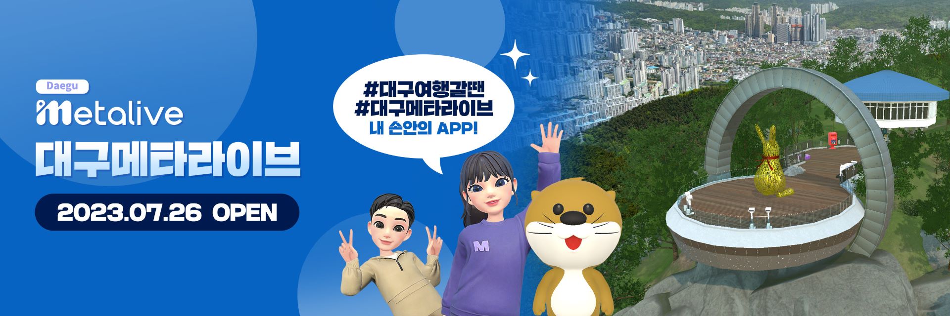 대구문화예술진흥원은 대구 가상관광 서비스를 메타버스 플랫폼인 '메타 라이브 애플리케이션'을 통해 제공하고 있습니다.메타 라이브 애플리케이션 내 대구 특별관에서는 메타버스 공간으로 구축한 동성로, 앞산 전망대, 83타워, 수성못, 대구미술관 가상 체험 서비스가 있습니다.대구의 마스코트 캐릭터 '도달쑤'가 등장...