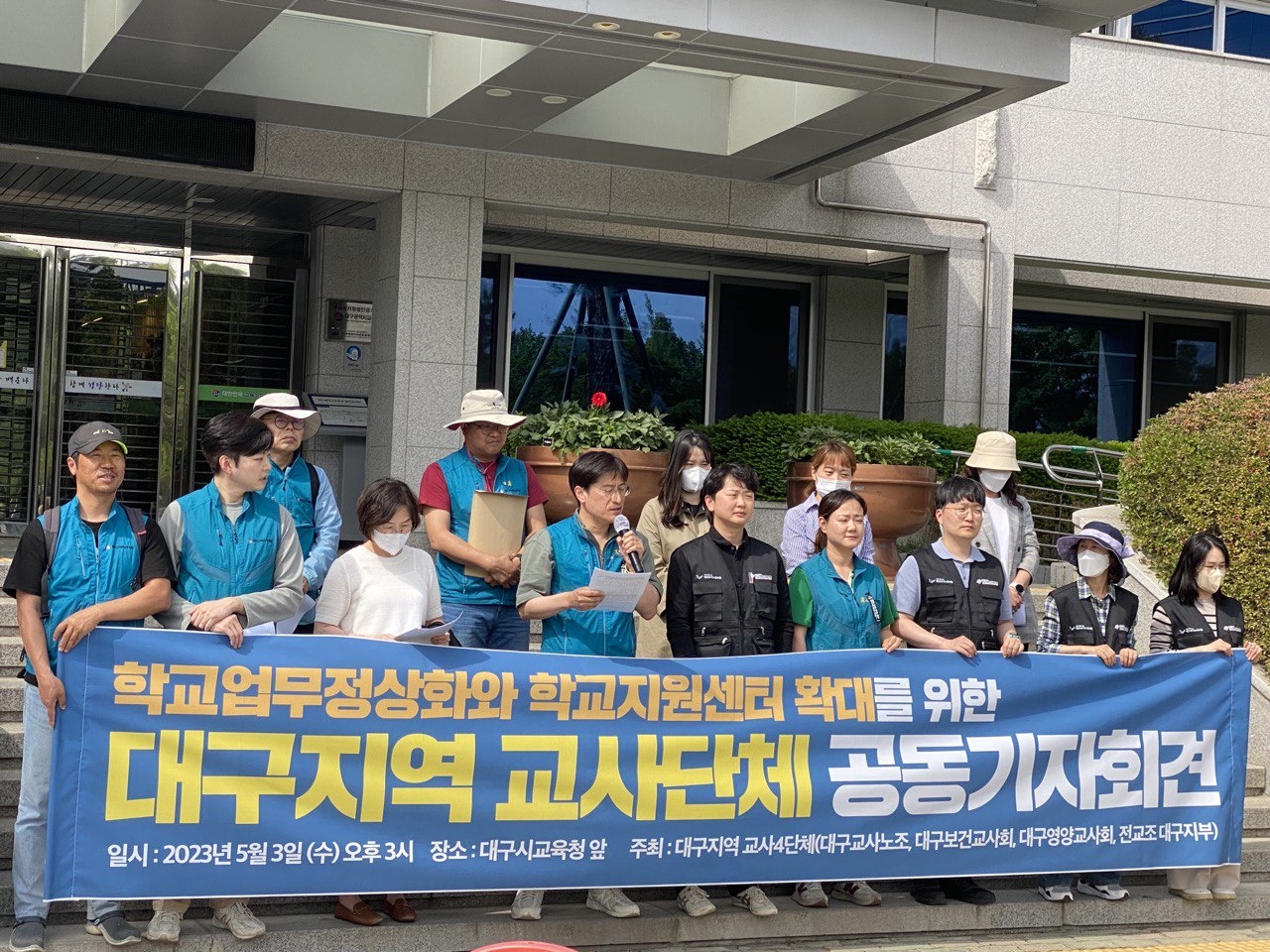 대구교사노조, 전교조 대구지부 등 대구지역 교사 4단체는 5월 3일 대구시교육청 앞에서 기자회견을 갖고 학교 지원센터 확대와 학교 업무 정상화를 요구했습니다.대구교육청이 2023년 1월 대구교육시설지원센터를 '대구 학교 지원센터'로 확대·개편하면서 인력의 70%를 시설 담당으로 채웠고, 행정지원인력 충원은 8명에...