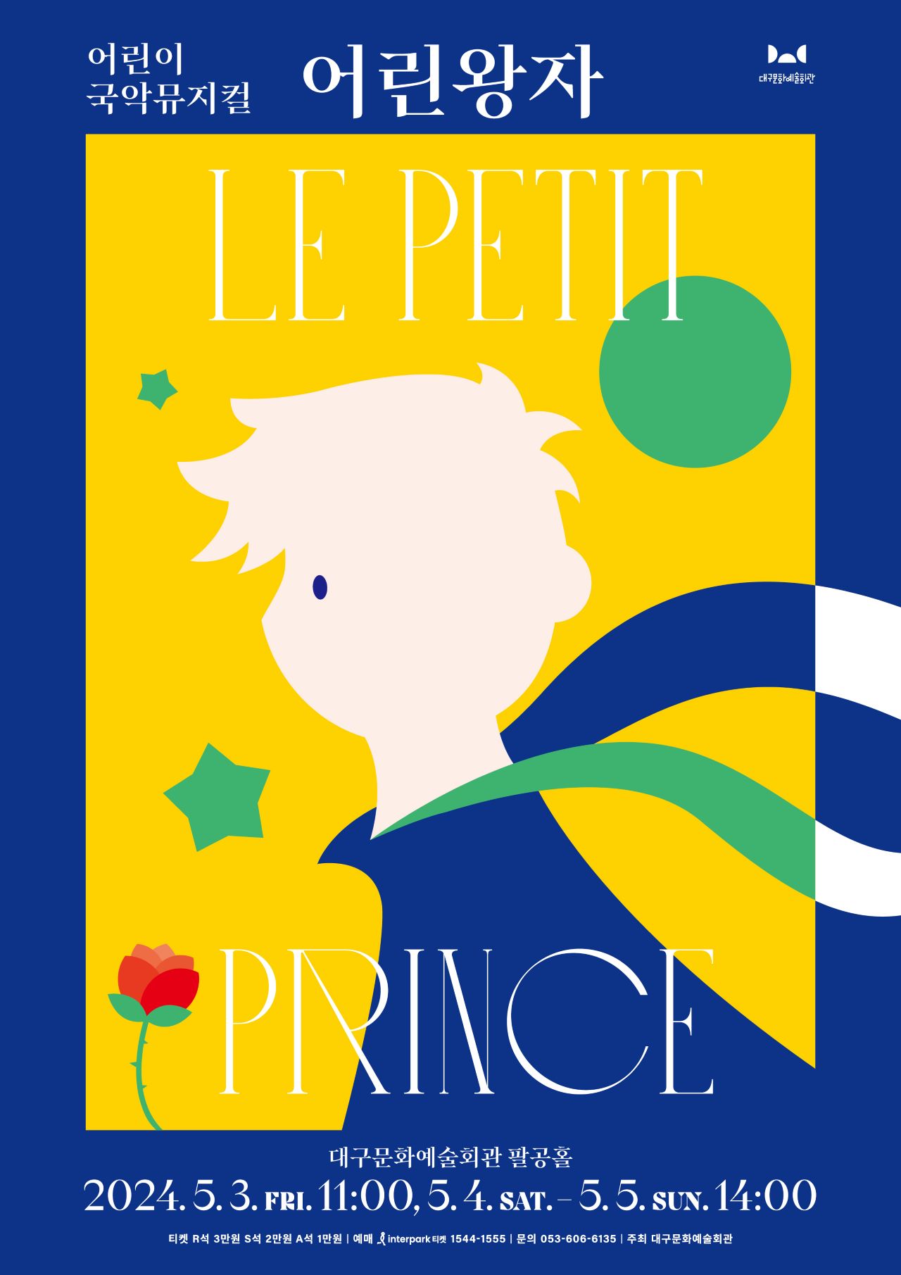 사진 제공 대구문화예술회관대구문화예술회관은 5월 가정의 달을 맞아 가족들이 함께 즐길 수 있는 어린이 국악 뮤지컬 어린왕자를 5월 3일부터 5일까지 3일간 대구문화예술회관 팔공홀에서 개최합니다.세계적 명작인 생텍쥐페리의 동화 어린 왕자를 원작으로 현대 아이들의 눈높이에 맞게 각색한 작품으로 연출가 추정화가...
