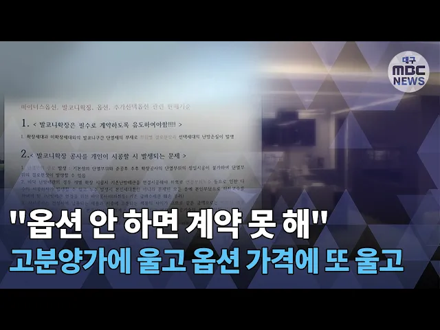 ◀앵커▶ 대구의 한 아파트 분양을 받은 계약자들이 자신들이 선택할 수 있는 옵션을 사실상 강요당했다고 주장하고 있습니다.금액이 수 천만원에 이르는데 아파트 시행사가 정부의 분양가 규제를 피해 수익을 챙기기 위한 '꼼수'라는 지적이 나오고 있습니다.윤영균 기자가 취재했습니다. ◀영상▶ 최근 분양을 마친...