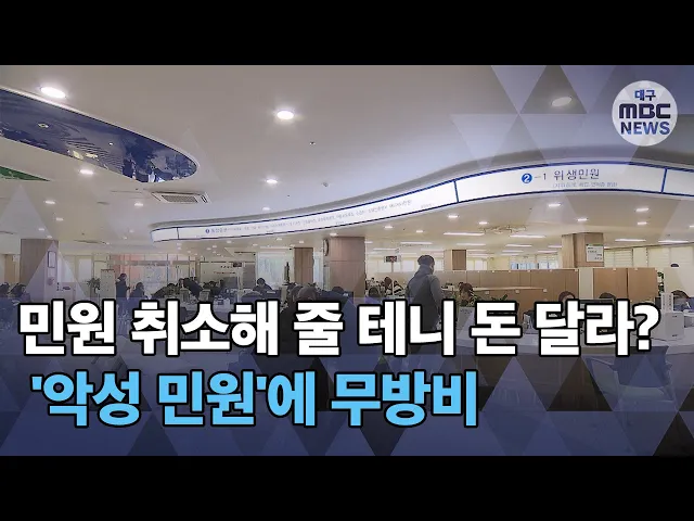 ◀ANC▶[남]관공서의 일 처리에 불만을 느껴 민원을 접수하는 경우가 적지 않습니다.민원이 여러 차례 접수되면해당 공무원에게 불이익이 가는 경우가 있는데요.[여]그런데 이런 약점을 악용해 민원을 취소해 주는 대가로 공무원에게 돈을 요구하는 악성 민원인도 있다고 합니다. 오늘 첫 소식은 윤영균 기자가 취재했습...