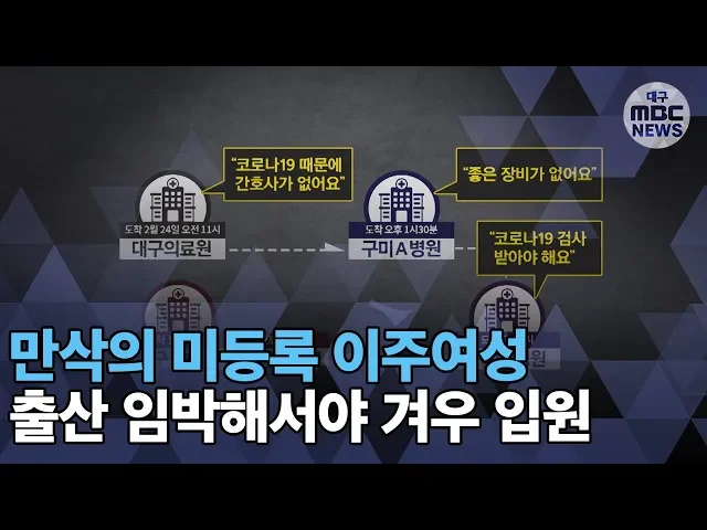 ◀ANC▶만삭의 이주여성이 산부인과 병원 네 곳을 옮겨 다니다 출산이 임박해서야 겨우 입원할 수 있었습니다.건강보험이 없는 미등록 이주노동자인데,다른 지역은 대구에서 왔다며 받아주지도 않았습니다.윤영균 기자가 취재했습니다. ◀END▶ ◀VCR▶대구에 사는 미등록 이주여성 A 씨는 진통이 시작되자 지난달 24일...