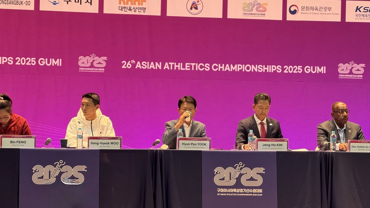 2025 구미 아시아 육상선수권대회를 하루 앞두고 구미시 복합스포츠센터에서 아시아 육상 스타들이 모인 프레스 컨퍼런스가 열렸습니다.아시아육상연맹 달란 알 하마드 회장의 인사말로 시작한 이번 행사는 김장호 구미시장과 육현표 대한육상연맹 회장의 환영 인사와 대회를 빛낼 메달리스트들의 각오가 이어졌습니다. 이...